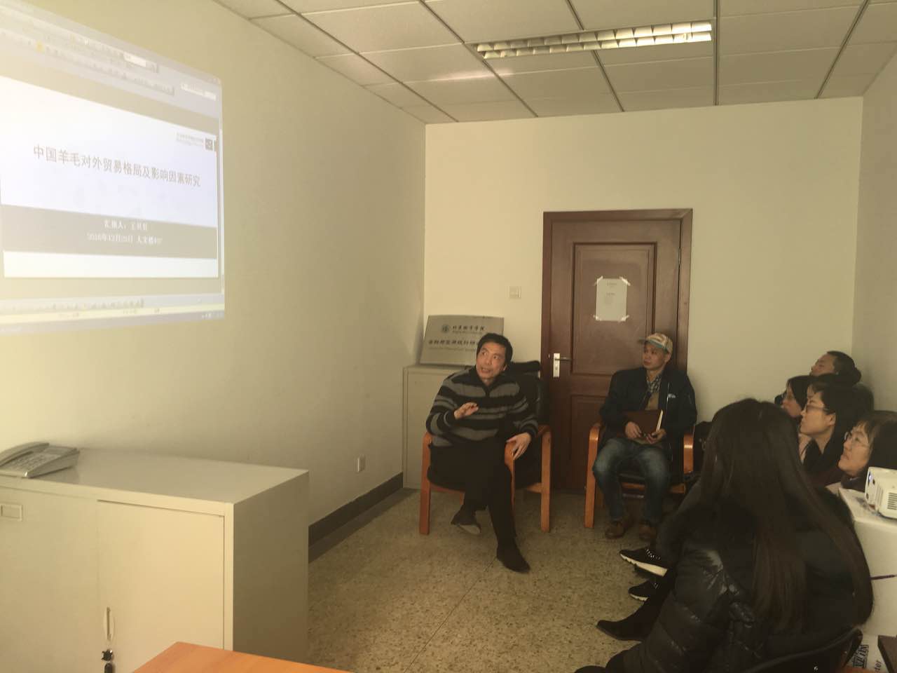 此次沙龙中,王贝贝老师重点介绍了中国原毛、洗净毛、羊毛条的贸易现状以及影响这三类商品进口与出口的价格与非价格因素,并借助其研究中所使用到的国际贸易模型向大家系统介绍了当前国际贸易实证研究的方法论及其发展情况。各位青年博士分别就其研究视角、方法展开了激烈讨论;孟尚雄教授在肯定了这一成果的研究价值的基础上,对进一步深化、细化相关研究以形成成熟的高水平研究成果进行了具体指标,并详细介绍了国际一流期刊的研究范式。