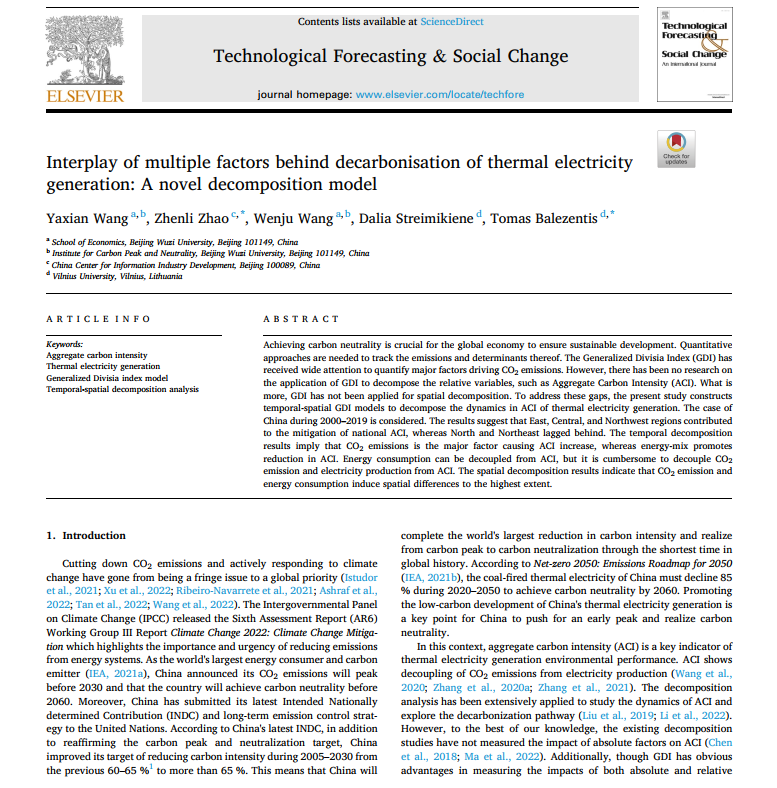 近日,公司王文举教授、王雅娴老师(第一作者)及国内外合作者在创新管理领域国际顶级期刊《Technological Forecasting and Social Change》,发表题为《Interplay of multiple factors behind decarbonisation of thermal electricity generation: A novel decomposition model》的论文成果。该论文得到了北京社科基金项目《双碳战略下首都能源绿色低碳发展的多市场协同机制研究》以及伟德源自英国始于1946青年基金项目《碳达峰碳中和下中国省级电力行业碳排放权分配机制研究》的资助。伟德国际bevictor1946和双碳研究院为该论文的第一单位。
