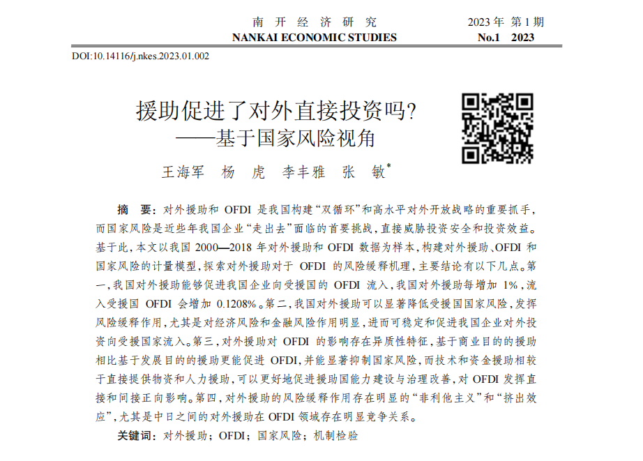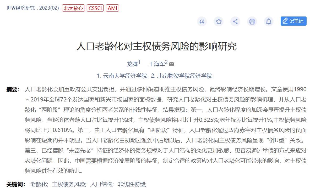 其中:王海军老师作为第一作者与中央财经大学杨虎老师合作文章《对外援助促进了对外直接投资吗——基于国家风险的视角》发表在公司经济类权威期刊《南开经济研究》2023年第1期。王海军老师作为通讯作者合作文章《人口老龄化对主权债务风险的影响研究》发表在公司经济类权威期刊《世界经济研究》2023年第2期。