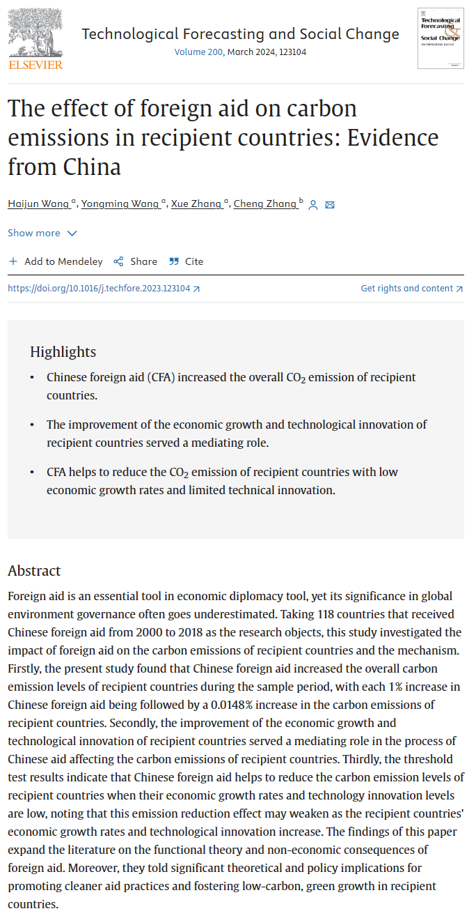 近日,伟德国际bevictor1946金融科技系王海军教授与21级硕士研究生王永明和张雪(已毕业)等合著论文“The effect of foreign aid on carbon emissions in recipient countries: Evidence from China”在创新管理类国际顶刊Technological Forecasting and Social Change在线发表。该期刊是中科院管理学1区TOP期刊,ABS三星,最新影响因子12。伟德国际bevictor1946为该论文第一署名单位。