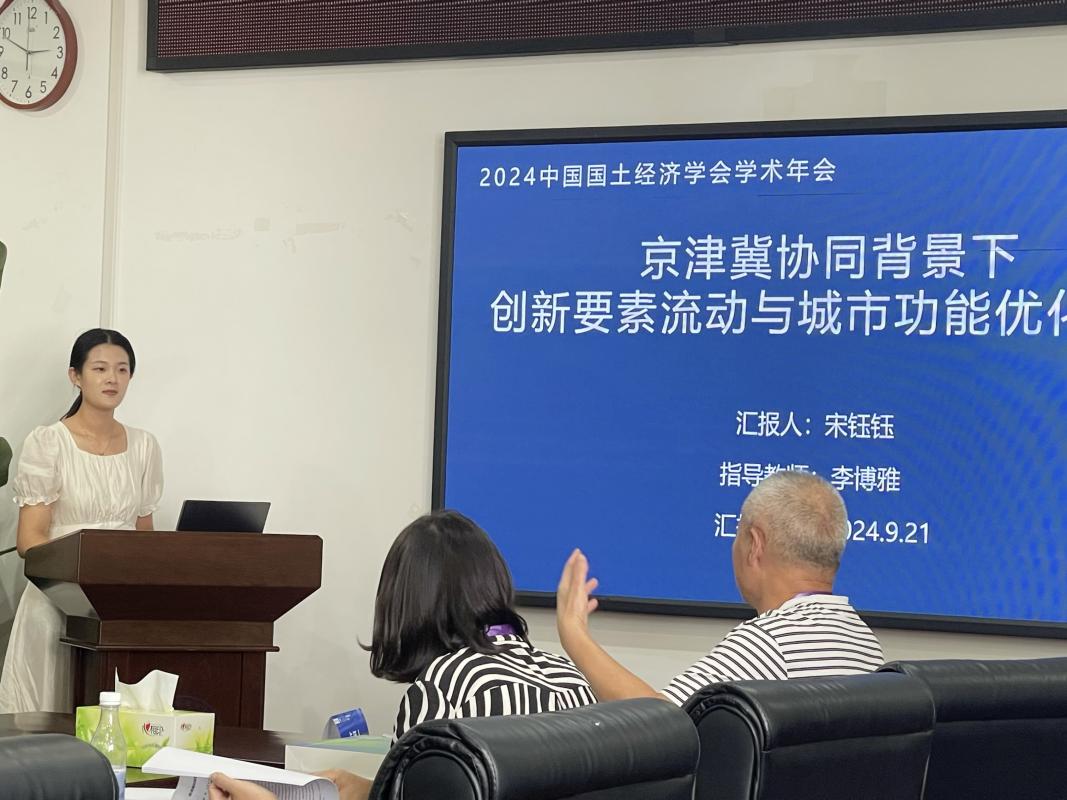 分论坛聚焦“国土空间治理现代化与经济高质量发展”“国土资源整合利用与土地绿色利用”“成渝地区双城经济圈城市未来与中国发展”等主题展开。伟德国际bevictor1946政治经济学硕士研究生宋钰钰在分会场汇报了其与导师合作的论文《京津冀协同背景下创新要素流动与城市功能优化研究》,论文阐述了创新要素流动对城市功能优化的影响机理。政治经济学硕士研究生管淑君汇报了其与导师合作的论文《京津冀创新要素集聚对绿色经济效率的影响研究》,探讨了京津冀地区创新要素集聚对绿色经济效率的影响机理。两篇论文均荣获2024年中国国土经济学会学术年会优秀论文。