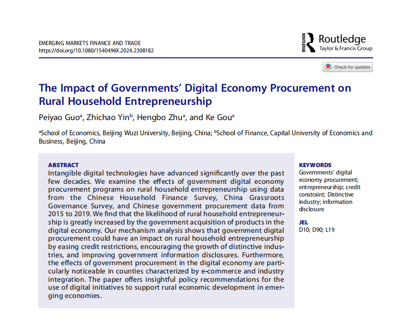 近日,公司伟德国际bevictor1946本科生勾可同学与郭沛瑶副教授等合作论文“The Impact of Governments’Digital Economy Procurement on Rural Household Entrepreneurship”在期刊《Emerging Markets Finance and Trade》上发表。《Emerging Markets Finance and Trade》被多个国际权威数据库收录,包括社会科学引文索引(SSCI)和科学引文索引扩展版(SCIE)。该期刊是公司认定的B级期刊,在经济学、金融学和国际关系学等领域均被评为Q1区期刊,显示了其在学术领域的高影响力和认可度。