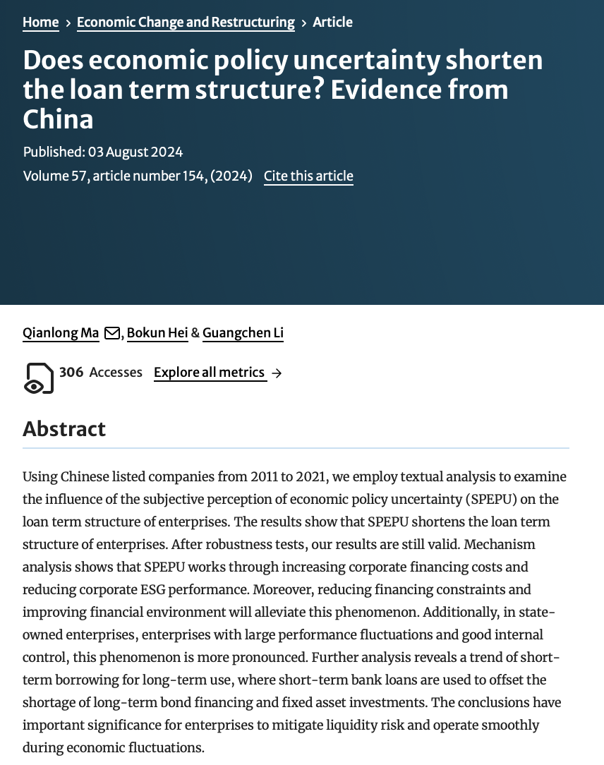 近日,公司2022级金融学专业硕士生马乾龙以第一作者及通讯作者身份在经济政策不确定性领域国际核心期刊《Economic Change and Restructuring》上发表题为“Does economic policy uncertainty shorten the loan term structure? Evidence from China”的学术论文。该刊是公司认定的B级期刊,中科院三区期刊,最新影响因子为4.0。此成果由马乾龙同学在青年教师李光臣指导下与硕士生黑波锟同学共同完成。该成果是公司寓教于研、以研促学、教研相长的充分体现。论文相关简介如下:
