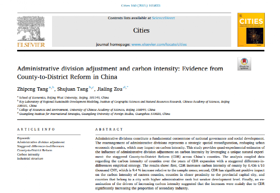 近日,公司经济学系唐志鹏教授(第一作者)与中科院地理科学与资源研究所研究生汤淑娟和广东外语外贸大学邹嘉龄副教授(通讯作者)合作学术论文“Administrative division adjustment and carbon intensity: Evidence from County-to-District Reform in China”在城市经济学国际期刊《Cities》上录用发表,该项研究成果得到了国家自然科学基金项目的资助。《Cities》期刊全名为《Cities: The International Journal of Urban Policy and Planning》(城市:城市政策与规划国际杂志),该期刊系SSCI检索期刊,是中科院经济学大类1区TOP期刊,JCR一区,最新影响因子为6.0,CiteScore值为11.2,连续多年在城市研究领域国际期刊排名前3,属于国际权威期刊。