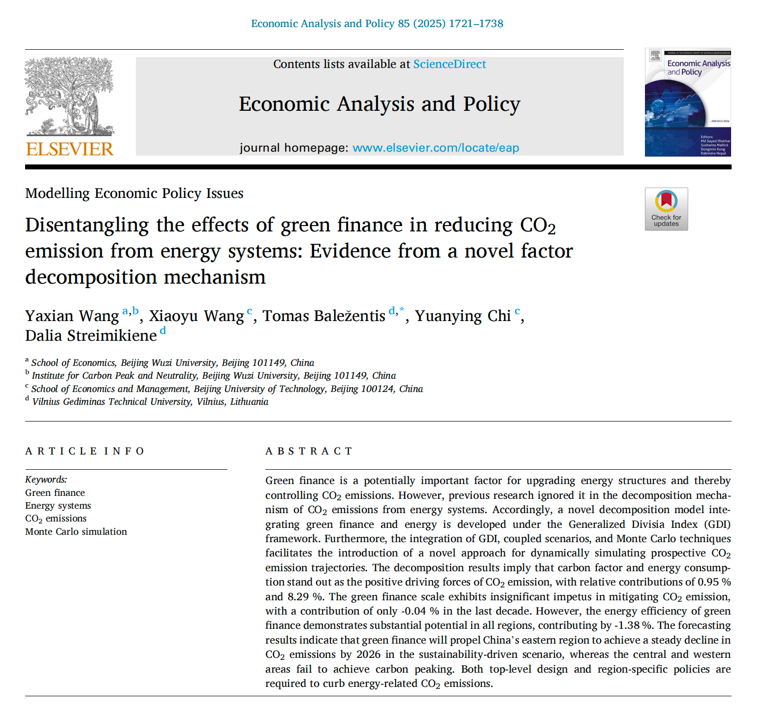 近日,公司金融学系王雅娴副教授(第一作者)和22级硕士生王晓瑜等合作学术论文“Disentangling the effects of green finance in reducing CO2emission from energy systems: Evidence from a novel factor decomposition mechanism”在国际期刊《Economic Analysis and Policy》上录用发表,该项研究成果得到了国家自然科学基金项目的资助。《Economic Analysis and Policy》期刊系SSCI检索期刊,是中科院经济学大类2区TOP期刊、JCR一区,最新影响因子为7.9,CiteScore值为9.8,属于国际权威期刊,该期刊是公司认定的A2级期刊。