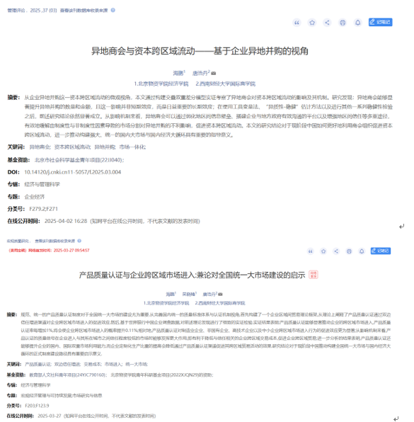 其中,海鹏老师作为第一作者与西南财经大学唐浩丹老师合作文章《异地商会与资本跨区域流动——基于企业异地并购的视角》发表在《管理评论》2025年第3期,该刊是公司认定的B1级期刊,最新研究因子为6.109。海鹏老师与22级国际贸易学硕士生吴晓楠同学合作文章《产品质量认证与企业跨区域市场进入:兼论对全国统一大市场建设的启示》拟发表在《宏观质量研究》2025年第2期,该刊是公司认定的B2级期刊,最新研究因子为5.311(该文章当前处于知网网络首发状态,是吴晓楠同学在校期间发表的第二篇CSSCI期刊文章)。