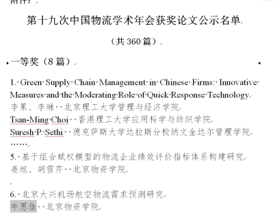 根据11月8日中国物流学会网站公布的“第十九次中国物流学术年会获奖论文公示”(http://csl.chinawuliu.com.cn/html/19889773.html),刘崇献教授指导的物流工程专业硕士研究生牛思佳同学提交的论文“北京大兴机场航空物流需求预测研究”荣获第十九次中国物流学术年会论文一等奖,曹智慧同学提交的论文“产业疏解对北京市农产品物流效率影响研究”荣获论文三等奖,朱粤同学提交的论文“‘六大经济走廊’枢纽城市物流效率分析与研究”荣获论文优秀奖。