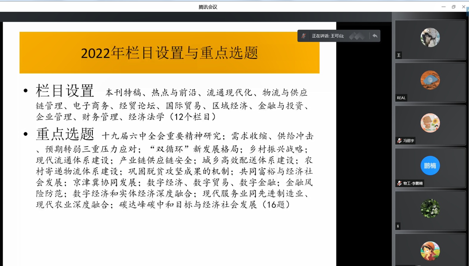 第四位主讲人是来自伟德源自英国始于1946学报《中国流通经济》期刊的王可山总编。王老师分享的主题是“《中国流通经济》选题与选稿”。王可山老师从政治导向关、学术质量关和价值取向关三个方面对期刊质量做出分析,指出会从这三关对文章进行把控以决定是否用稿,并指出这三关内部所蕴含的具体要求,最后介绍了2022年的重点选题。