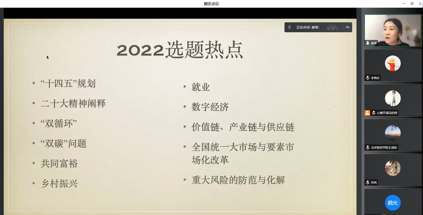 第三位主讲人是《经济与管理研究》期刊编辑部的副主任姜莱老师。姜老师分享的主题是“学术论文写作与热点选题思考”。姜莱老师在前二位老师分享内容的基础之上,对论文标题的选择方面进行深入分析,列举了一些过往经手过的问题标题,并对其要点进行归纳总结,随后又对文章的结构、文献综述与理论分析、实证研究、政策建议的提炼和学术道德相关问题进行了深入浅出地分析讲解,在最后,姜老师还特别指出了一些2022年的热点选题,给处在开题困境中的同学们提供灵感和方向。