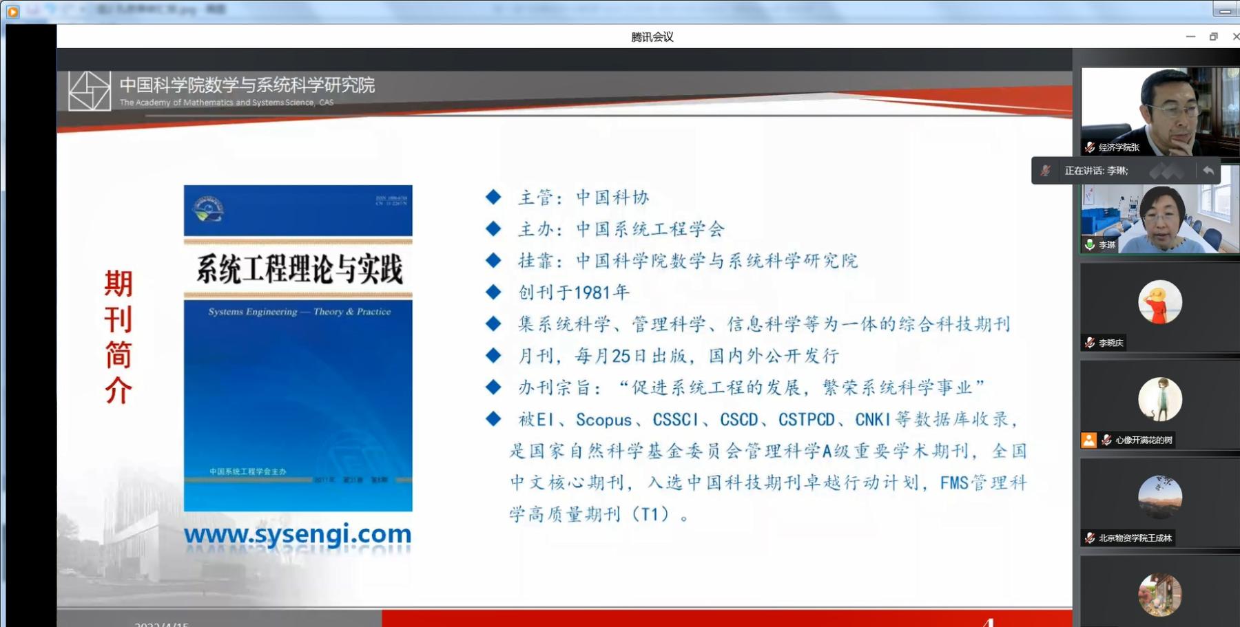 开坊会于4月15日9:00正式召开,邀请到的嘉宾有:中国科公司系统科学研究所副所长、《系统工程理论与实践》主编杨晓光研究员,《系统工程理论与实践》编辑部主任李琳,《经济与管理研究》编辑部副主任姜莱博士后,《中国流通经济》总编王可山教授。会议上半场由伟德国际bevictor1946经理张国胜主持,下半场由伟德国际bevictor1946副经理李晓庆主持,共有70余名师生线上参会。