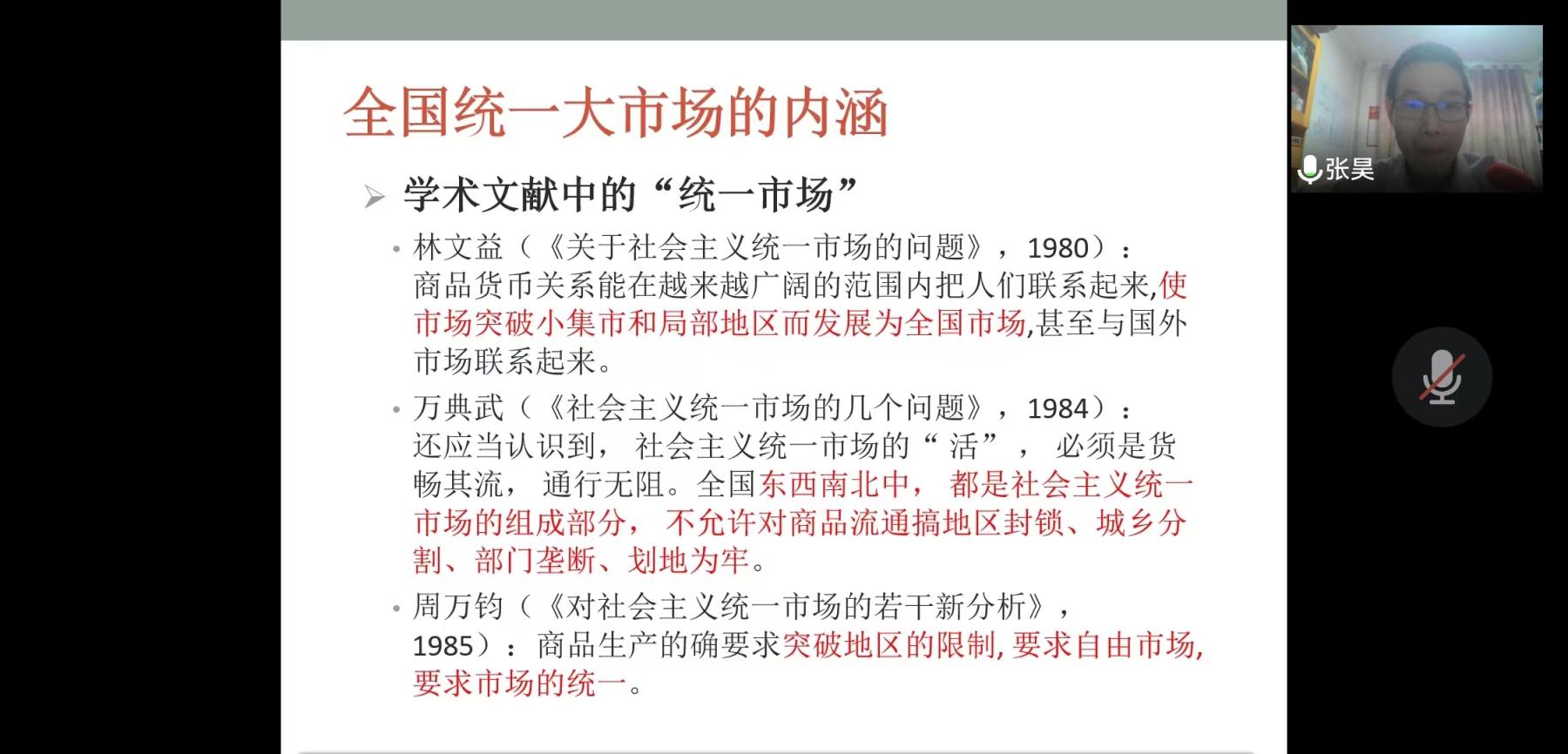 2022年5月29日下午14:00,第五期伟德国际bevictor1946前沿系列讲座如期在线上举行。本场讲座邀请到中国社会科公司财经战略研究院张昊副研究员,做了关于“建设全国统一大市场的内涵与重点”的主题讲座。伟德国际bevictor1946副经理李晓庆、产业经济学的黄雨婷副教授、邹旭鑫老师等40多位师生共同参会交流。
