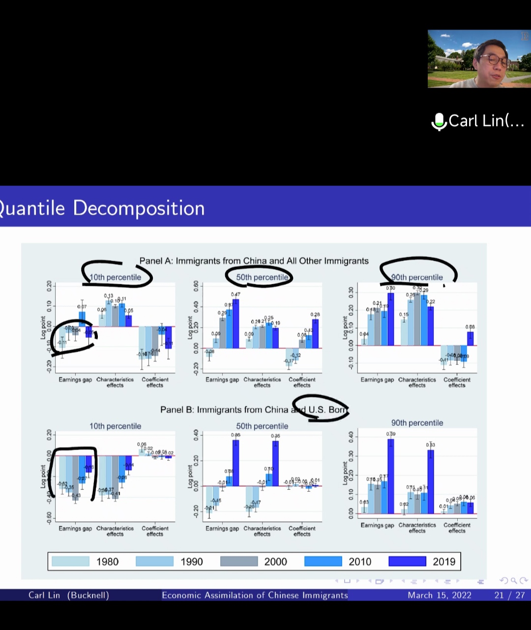 关于论文分享方面,林老师首先了描述了过去40年美国的中国移民迅速增长的时代背景,然后使用数据分析了中国移民与其他国家的移民以及美国本土居民在劳动力市场的表现,发现中国移民的在工资收入在过去四十年从落后到赶上,最后超过了其他移民乃至美国本土居民。之后林老师用明瑟方程构建实证模型,分析研究中国移民的各种特征对收入的影响。最后发现,中国移民在美国以外的受教育水平显著影响了其在美国的收入。论文分享完成,多名师生向林老师请教问题,林老师均进行了一一耐心解答。