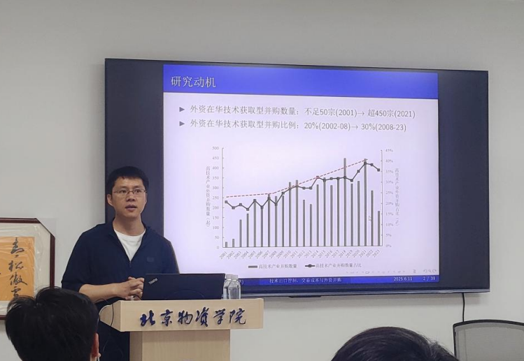 6月11日14:30,2025年第二期前沿系列学术讲座在人文楼515顺利举办。本次邀请到了对外经济贸易大学国际经济贸易公司谢红军副教授,为公司师生带来题为“技术出口管制、交易成本与外资并购”最新研究成果的分享。谢红军老师的研究方向为跨国公司与直接投资领域,已在《经济研究》《管理世界》等权威期刊刊文十余篇,曾获第七届洪银兴经济学奖(青年)、安子介国际贸易研究优秀论文奖等奖项。讲座由副经理李晓庆主持,郭龙飞副教授等近20名师生参会交流。