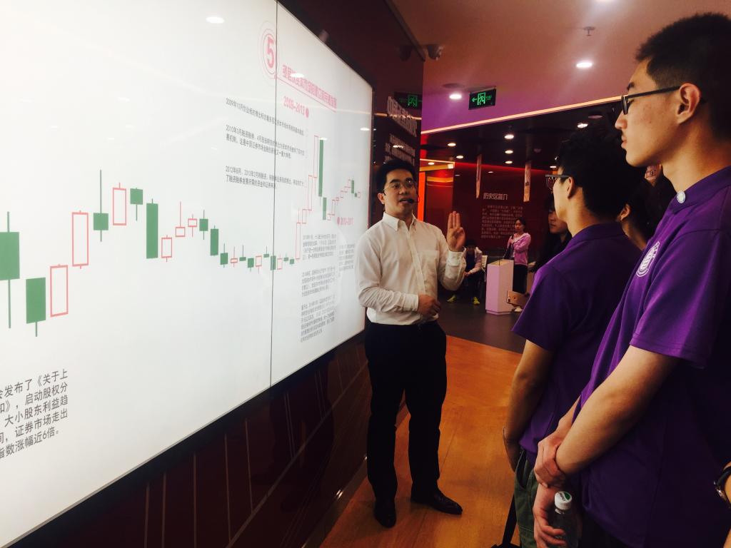 紧接着,同学们在老师的带领下参观了中信建投证券投资者教育基地的产品展示区。产品展示区共分为四个区域:在历史区,通过展柜和展墙上的资料以及老师的讲解答疑,同学们了解到历史上金融市场发展的大事件和我国不同时期的金融市场发展历程。在品种区,同学们学习到了股票市场最常见的专业知识。在理念区,通过大数据分析等资料了解到投资规律曲线。在风险区,通过丰富的股市案例介绍让同学们领回了“投资有风险,入市需谨慎”,牢固树立风险意识。
