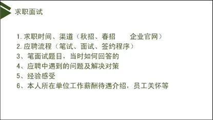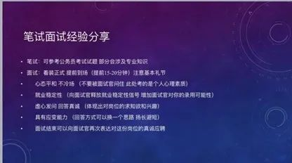 首先,笔试面试经验方面,笔试准备上,企业、公务员、事业单位、政策性企业可能涉及行测、申论和英语,银行等金融机构还注重考察经管专业知识,建议提前准备积累专业知识。面试准备上,学姐介绍了自我介绍、结构化面试、多对多面试等环节的注意事项,提醒、大家要自信,有重点、有特色地介绍自己,在面试过程中保持平和的心态并向面试官释放就业稳定性的信号尤为重要。最后在面试结束后可以向面试官再次表达对这份岗位的真诚应聘,增加录用的可能性。