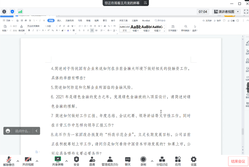 接着,王月龙从自身经历出发,带着同学们分享了北京某公司财务资产相关的笔试试题,同学们积极思考。学长也表明在笔试中专业知识的重要性。