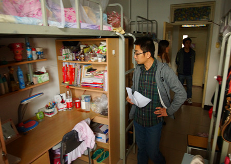 本次检查的主要内容包括卫生和安全两大方面。检查中王有老师亲自走访了每一个寝室,不仅对每个宿舍的整体卫生环境,包括地面是否干净、垃圾是否清理等提出了要求;同时也对个人的卫生情况,包括床铺是否整洁、物品摆放是否整齐等也提出了意见。同时王有老师针对寝室防盗安全情况和用电安全情况进行了仔细的审查,对宿舍里杂乱的插座板提出了整改的要求。