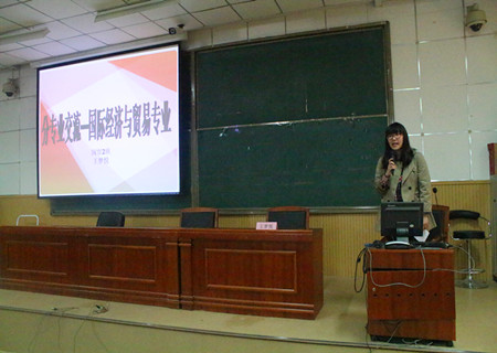 接下来,四个专业的老师也依次介绍了本专业的背景和优势。王晓芳老师从历史沿革、团队队伍、教学资源和培养方案四方面向同学们详细介绍了经济学专业;王宝森老师也从专业前景、就业状况及课程设置等方面对金融学做了介绍;原玲玲老师则着重讲解了自己的国贸情结和就业方向;刘宏老师则强调证券期货专业是风险与挑战并存,但目前实体企业却对本专业员工有着迫切的需求。