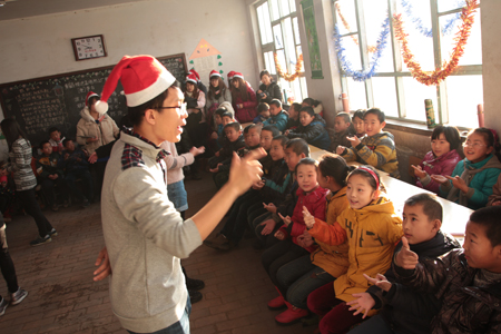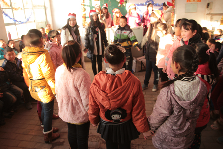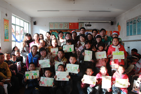 12月6日清晨志愿者们来到了万全县新村小学,在路上就感受到了这里的人们生活的艰苦。在新村小公司领导的协助下开始了一天的活动。为了让孩子们感受到即将来临的圣诞节的欢乐气氛,志愿者们纷纷布置教室,戴上圣诞帽,与孩子们做起了游戏;接着志愿者为孩子们展示了精心准备的舞蹈、手语等一系列表演;随后,志愿者拿出事先准备好的画笔和画纸,让孩子们通过手中的画笔绘画出属于他们自己的梦想。整个上午都在欢声笑语中度过。