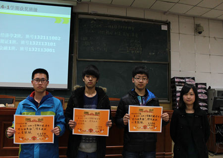 在会议上,夏蓓老师将上学期大一各班学习状态、期末成绩、获奖等表现情况进行了总结。在第一学期的考试中,有些科目总体来说不太理想,比如经济学导论的不及格人数较多,因此夏蓓老师希望同学们能够更加注重专业学习,争取在新学期学习中“消灭”不及格现象。同时,从上学期八个班期末加权平均成绩排名中,13级经济学二班(班号132111002)以83.83分被评为“学习先锋班”;结合上学期出勤情况与参与公司与公司各项活动情况,期证1班(班号132113101)、金融1班(班号132113001)被评为“综合优秀班”。在会上,夏蓓老师对以上三个班级提出了表扬并发放奖状,并鼓励其他班级在新学期中积极表现,创造“你争我夺”的竞争局面。