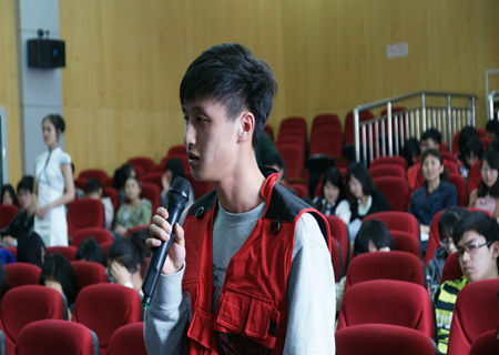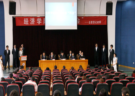 大会第一个环节是记者提问;由国贸一班杨晓阳同学进行开场提问,向“总理”提出的关于新的一年两岸关系问题。“总理”对这个问题进行了认真深度的回答并通过标志性的手势赢得了台下阵阵掌声。随后“媒体记者团”向总理、各部部长提出针对且敏感性十足的问题。其中包括马航失联、反腐、人民币贬值、世界经济和房地产等问题。模拟主席们认真并风趣地解答了记者们提出的各种问题,颇有深度和技巧。在持续了1个小时40分钟的答记者问环节后,“总理”模仿者周楷健同学以他独有的风格进行“答记者问”总结,并对与会“记者”表示感谢,生动形象、惟妙惟肖。