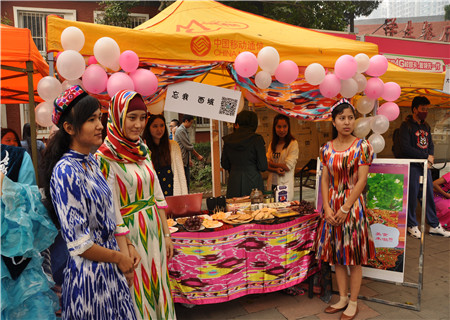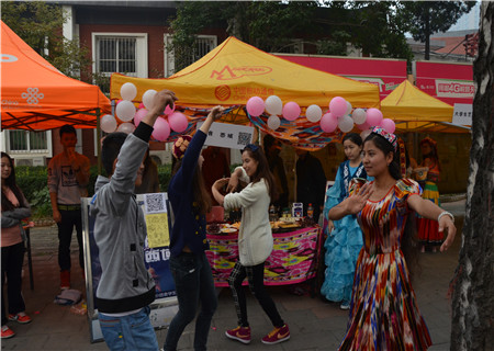 “忘我·西域”展口主要体现神秘魅力的西域文化,展出绚丽的西域服饰。介绍丰富的西域文化的同时,更有飘香迷人的西域食物以供大家免费品尝,色香味俱全的大盘鸡和辣子鸡备受欢迎。第二天展出的新疆水果和新疆特产大受好评。“忘我·西域”展口前人头攒动,大家通过伟德国际bevictor1946主办的这个展口了解到了丰富多彩的西域文化。