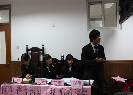 打响第一场辩论赛的是金融二班和国贸一班,各班的辩手们展现口才,思维敏捷。这场主题是“网络语言是否是语言文化的污染”。首先是正方的一辩进行观点陈述:网络语言使生活更多样化更丰富多彩,网络语言非污染。正方对于网络语言是否是污染进行了一系列的反问和例证。接着反方进行驳辩:网络语言应考虑到使用人群。辩论队双方都不甘示弱,条理清晰的阐述自方观点。在自由辩论环节,各方辩手妙语连珠,步步紧逼,环环相扣,为大家呈现了一场精彩的辩论赛。