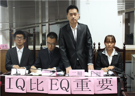 随着辩论赛第一场的圆满落幕,第二场辩论赛紧随其后,由经济一班和金融一班组成的第二组辩论,辩题“是EQ,IQ谁更重要”。正方主张IQ比EQ更为重要。正方用例证辩论,她通过举例论证各种名人实例说明情商随人年龄增长而增长,而社会需要高智商来推动社会科技的发展,所以不能否定智商的重要性。而反方四辩毫不示弱,用道理论证:99%汗水+1%灵感=成功,智商低可以后天努力改变。在一方陈述完观点之后,另一方紧接着发出诘问,辩论场面紧张激烈。
