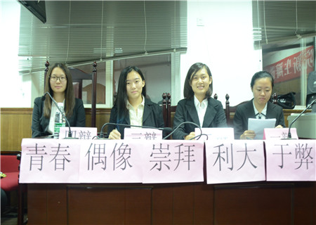 最后一场收尾的辩论是由期证二班对阵经济二班,辩题为“青春偶像利大于弊还是弊大于利”。正方支持利大于弊。正方从社会凝聚力,对青少年动力,和媒体号召力方面进行辩论。反方从盲目追星,过度注重外表和民族精神方面进行了辩论。双方互不相让,各自不甘示弱,一环扣一环。接下来两方在对辩、质询和自由辩中展现出各自清晰地逻辑和犀利的看法,向大家展示了各方辩手的不俗口才。