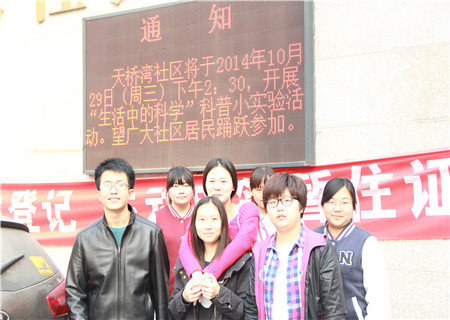 10月29日下午2:00,伟德国际bevictor1946青年志愿者协会的志愿者们来到天桥湾社区,进行了一次志愿活动。这是一次科普实验活动,主题为“生活中的科学”,天桥湾社区居民参与了此次活动。