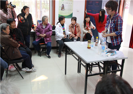 此次科普实验活动于14:30正式开始,志愿者们首先向在座的小区居民概括说明了即将开始的三个科学实验,分别是鉴别香油、黑米和蜂蜜,大家对此表现出了浓厚的兴趣,志愿者们在居民们认真的注视下开始了实验。首先是鉴别香油:将香油滴入清水中,会迅速溶解,但市面上有些香油被商家掺杂进普通食用油,这样的香油滴入水中则会在水面悬浮一会,志愿者作出解释:“不同油的张力不同,假香油张力大,因此不会马上溶于水。”;随后,我们的志愿者又做了鉴别黑米的实验:把黑米分别放入自来水、白醋和小苏打水中,自来水会微微泛紫,白醋红的明显,而小苏打水呈蓝紫色。而染色的米,不管用什么浸泡都不会变色。志愿者对此说明原因:“因黑米中含有花青素,会使自来水变色,遇酸碱变色更明显。”;最后是鉴别蜂蜜的实验:将兑水和未兑水的蜂蜜滴在一张纸巾上,未兑水的会在纸上聚成一个水球,久久不扩散,如果是兑过水的蜂蜜,纸上的蜂蜜团四周一圈会渐渐出现水渍,并逐渐向周围扩散。在实验过程中,居民们进行了热烈的讨论,志愿者们也耐心地为这些长辈们加以讲解,场面十分热闹。实验过后,居民们又向志愿者询问了生活中的其他鉴别真假的问题,志愿者们都热心的给予了解答,遇到不明白的也礼貌地向居民们表示,下次来到这里的时候会给他们带来答案。