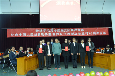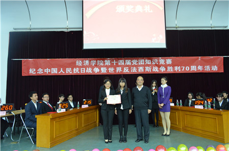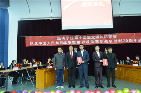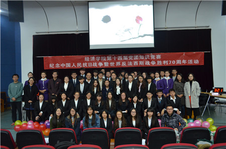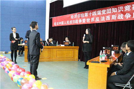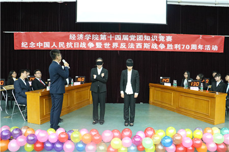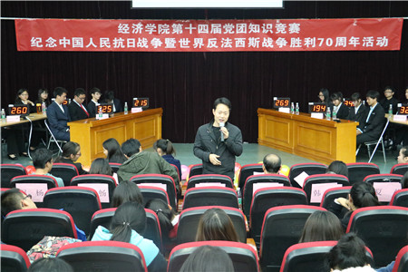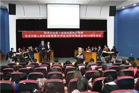 2015年11月4日晚6时国际交流中心二层会议厅,伟德国际bevictor1946第十四届党团知识竞赛暨纪念中国人民抗日战争和世界反法西斯战争胜利70周年主题教育活动隆重召开。校思政部刘建宁教授、校武装部张立柱老师作为特邀嘉宾出席了本次活动,伟德国际bevictor1946党委书记胡伟老师、党委副书记张建宝老师、分团委书记夏蓓老师、专职辅导员韩春丽老师、陆畅老师以及新生辅导员程杨老师担任评委工作,2015级全体新生及各班班主任助理观看了本次比赛。
