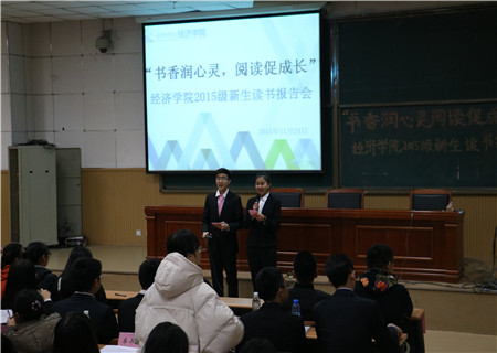 伟德国际bevictor1946大一引航工程开展读书文化月活动,囊括了读书漂流、图书市集、班级读书分享等系列活动,营造了浓郁的读书氛围,培养了良好的读书习惯。11月24日下午6:30在二教第一报告厅举行以“书香润心灵,阅读促成长”为主题的2015级新生读书报告会。出席这次活动的评委老师有经济学系主任车卉淳老师、新生班主任战雪丽老师、刘健老师、伟德国际bevictor1946分团委书记夏蓓老师、2014级专职辅导员陆畅老师、2015级专职辅导员程杨老师。