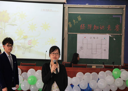 比赛开始后,12位同学分为6组,进行较量。比赛过程中对各位选手进行了经济知识方面的考察,每位参赛者都展现出了深厚的知识功底。经过第一轮较量,首先决出了6名出线者。而后其余6名选手通过竞猜商品价格的方式决出最后两名出线选手,在此阶段,不仅考察了选手们的经济知识,同时也考验了他们的日常生活经验。