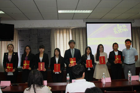 第二项颁发的是经英show奖项,该活动内容既与经济问题息息相关,契合经济文化节的主题,又强调专业性与英语相结合,为同学们提供一个学习和交流英语的平台,提高其对英语口语训练及专业英语学习的积极性。本次比赛组队采用个人与小组结合的方式,共有20组、30余名同学参赛。初赛采用英文演说的方式,选出英语口语综合能力较强的12组晋级决赛。参赛小组的展示方式有演讲、电影配音、PPT演说等,选手们用自信和睿智征服了在场的观众和评委。校团委书记庞波老师为获奖小组代表们颁发了证书,并与大家合影留念。第一名获奖代表用流利的英语发表了获奖感言,强调学习语言要注重兴趣培养,要多说、多听、多用,要充满信心,地道的口语发音及流畅的表述让大家无比折服。