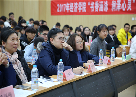 读书报告大赛上,同学们积极参与,认真倾听,踊跃参与。各班选手和自己的高年级搭档,结合ppt为全体同学推荐自己读过的好书。同学们通过富有创意的方式,相声、朗诵、演讲结合,从生活中的现象阐述《生活中的经济学》《牛奶可乐经济学》,从自身深入思考《道德情操论》,阐述《国富论》《经济学原理》,更从历史、人文角度角度介绍了《史记》《明朝的那些事儿》《平凡的世界》和《撒哈拉的故事》。评委根据选手的表现,进行点评和提问,引导大家的深入思考,指出他们的不足,选手们镇定回答,条条剖析,表现出色。最后许春燕老师进行了最后的总结,希望同学们能多读书,读好书——四年内读完一立方米的书,加强自己的阅读修养,丰富自己的精神世界。最后主持人宣布了获奖名单一等奖:期证一班,二等奖:经济一班、国贸二班,三等奖:金融一班、金融二班,国际金融,优秀奖:经济二班、期证二班、国贸一班。