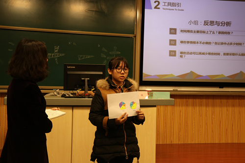 然后,张悦老师通过两个小工具,让我们可以有效地解决自身的问题,改善现在生活的情况。第一个小工具是时间饼状图。它可以让同学们直观的感受到日常的时间分配。可以提高同学们分配时间的能力。第二个小工具是四象限矩阵图。它不同于一般的时间轴,而是根据事件的紧急程度和重要程度划分事件的工具。它可以帮助我们在有限的时间内选择最重要紧急的事件。从而避免我们浪费时间去做相对没有意义的事。老师用一个贴近现实的例子,让我们更加理解了时间轴的作用。通过上面的这两个生活管理的实用工具,让我们知道了管理、分配生活的方法。