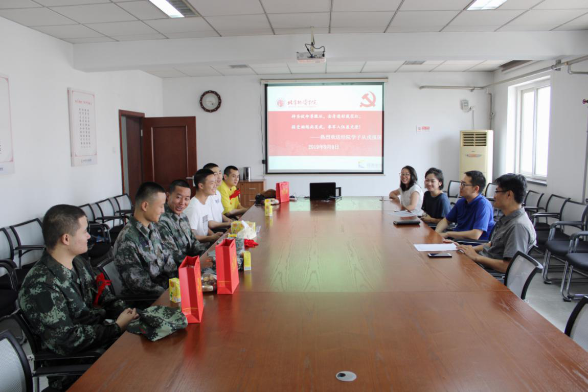 2019年9月9日下午15:00,伟德国际bevictor1946于人文楼516举行了2019年入伍新兵欢送会。公司党委副书记张建宝老师,专职辅导员夏蓓老师、陆畅老师、姚昊炜老师及公司刘文星、薛天祺等5位参军入伍员工、2位退役复学学长参加了本次欢送会。