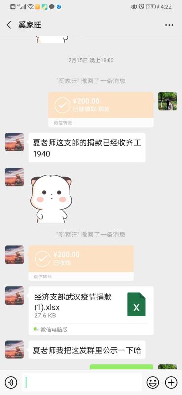 让我们感动的还有数字之后的故事。有身在国外心系大家安全的期证系刘旗老师,他在法国东拼西凑买到了1000个口罩装满行李箱,回国后免费赠送师生,保一方平安。有家庭并不富裕的员工献出爱心,他们认为自己困难的时候得到了党和国家的帮助,现在国家有难了,自己也要出力支援。还有师生一对一联系身在湖北的同学们,关心他们的健康,尽可能帮助解决学习生活所需,为他们加油鼓劲儿!