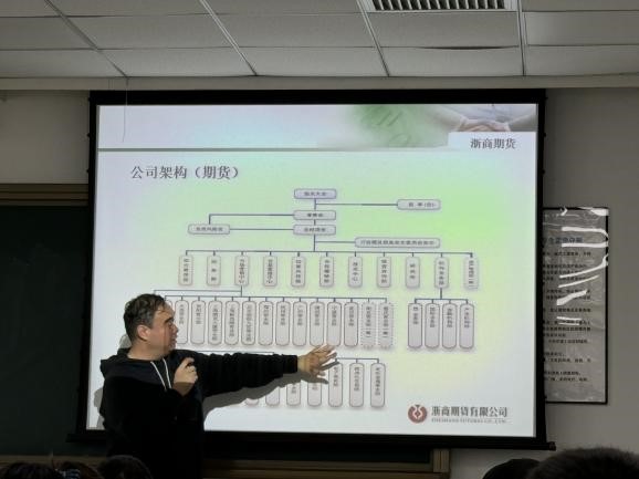 此外,屈晓宁老师还向同学们介绍了浙商期货的公司脉络框架、部分工作内容、网点布局、技术服务以及研究咨询等方面的内容。他特别讲解了期现公司是如何服务实体经济的,让同学们对期货行业有了更加全面和深入的认识。