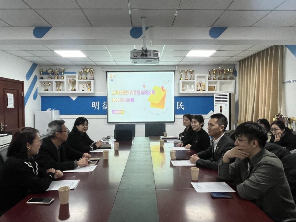 上海归藏投资管理有限公司人力总监贺湘君随后在公司会议室举办招聘宣讲会。通过生动的PPT展示和详细讲解,向同学们介绍了企业概况、岗位需求、薪资待遇和职业发展路径等内容。她表示公司注重以人为本,通过采用师徒制一对一专业培养、轮岗制多部门全面培养等方式,注重对员工的培训。公司氛围融洽,劳有所得,注重成长。