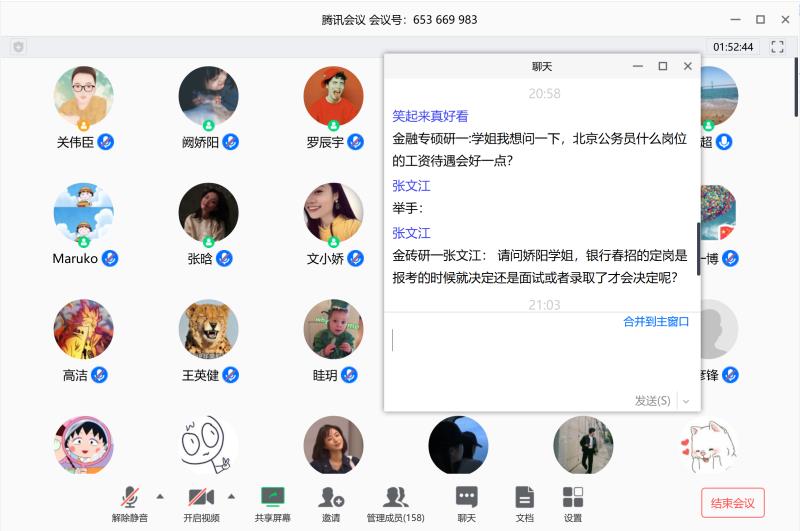 在自由讨论环节,许多同学提出例如缺少实习经历、求职专业对口等问题,学长学姐们都给予了耐心的回答。相信本次暖心交流会在一定程度上为同学们解开了心中的疑惑和迷茫。陆畅老师总结提出,活动正如我们举办时的宗旨,疫情期间求职不断线,希望每位同学都能找到未来发展的方向,脚踏实地向目标前进。
