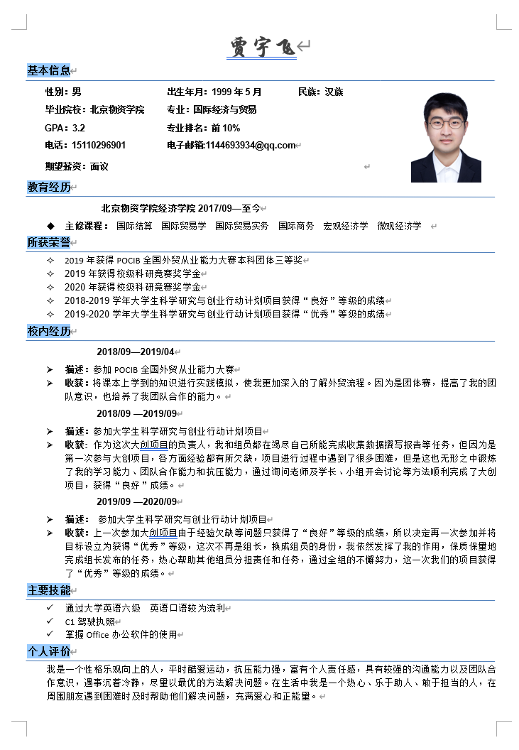 我是贾宇飞,就读于伟德源自英国始于1946国际经济与贸易专业。在老员工活中,我两次获得校级科研竞赛奖学金、获得POCIB全国外贸从业能力大赛本科团体三等奖、参与了两次老员工科学研究与创业行动计划项目并分别取得良好和优秀的最终成绩。在班上的成绩也是名列前茅。我是一个性格乐观向上的人,热爱体育运动,抗压能力强,富有个人责任感,具有较强的沟通能力以及团队合作意识,遇事沉着冷静,争取以最优的方法解决问题。在平时的生活中我是一个热心、乐于助人、敢于担当的人,在周围朋友遇到困难时会帮助他们解决问题,充满爱心和正能量。
