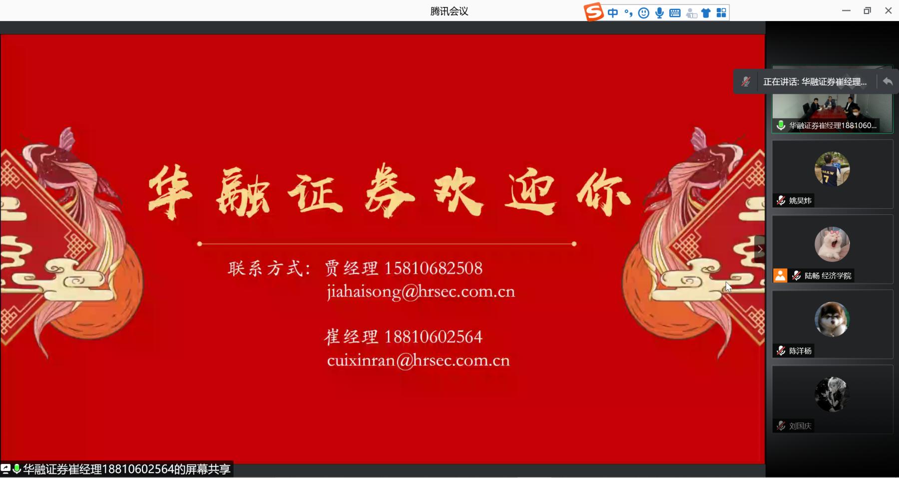 其中财达期货的邹老师明确了本次招聘的岗位有综合岗和市场业务岗;冠通期货的郭老师强调了期货从业资格证书的必要性,提醒大家在校期间应多考取相关证书,提高就业竞争优势;随后赵总也强调了冠通期货本次招聘的岗位有后台综合岗、交易风控岗、互联网金融岗和市场开发岗;华融证券以宣传片的形式呈现了企业的信息,贾经理介绍了华融证券可提供的岗位主要有理财经理、客户经理、投资顾问等,另外贾经理强调入职后企业会进行相应培训,希望大家可以根据自己的职业规划借助该平台更好的发展,并热切地期待大家的加入;开源证券的屈老师强调本次开源证券校园招聘的岗位以理财顾问为主,并对该岗位的职责以及实习培训等方面进行了简要介绍;最后兴业银行的盖昊老师在介绍企业概况的同时,介绍了进入该公司工作的两条主线:零售客户经理(以贷款为主)、零售理财经理(以销售理财产品为主)。