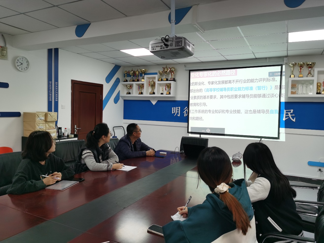 孙晓曦首先从员工、自身、工作的角度分别阐述了高校辅导员谈心谈话的重要意义与必要价值;其次,从谈心谈话“与日常沟通的区别”、“与心理咨询的区别”、“素质能力结构”三个方面介绍了谈心谈话的概念界定和内涵解析。汪明春重点强调了高校辅导员与员工谈心谈话的时间节点,同时从“全面覆盖”、“贯穿始终”、“有的放矢”、“协调统筹”四方面讲解说明了谈心谈话的原则,介绍了谈心谈话的流程并演示了“一次性心理访谈”的流程示范。随后,辅导员们对今天的培训内容进行了总结,并根据院系特点和工作中遇到的实际情况,针对实际开展谈心谈话中面临的困境、应对困境的策略以及具体实施方案进行了研讨。