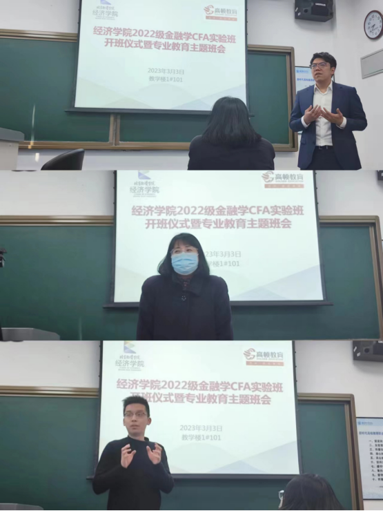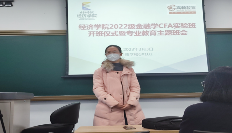 2023年3月3日,2022级金融学CFA实验班在第一教学楼101举行开班仪式暨专业教育 主题班会。伟德国际bevictor1946副经理原玲玲、CFA实验班项目负责人王琎、CFA实验班辅导员黄珊珊,高顿教育华北项目负责人厉亚鹏、高顿教育研究院华北经理崔中石,以及2022级金融学CFA实验班全体同学参会,会议由王琎主持。