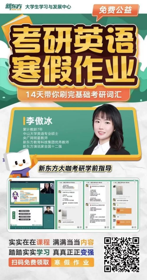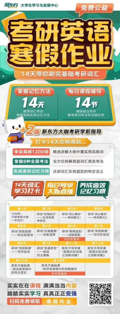 为同学们考研英语水平的提升提供帮助,伟德国际bevictor1946学习研究部推出“14天考研英语课程寒假作业打卡”活动,具体活动信息如下。