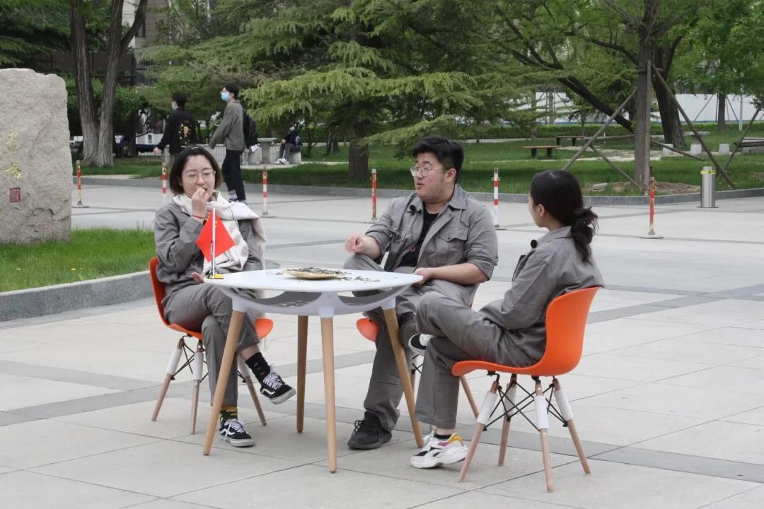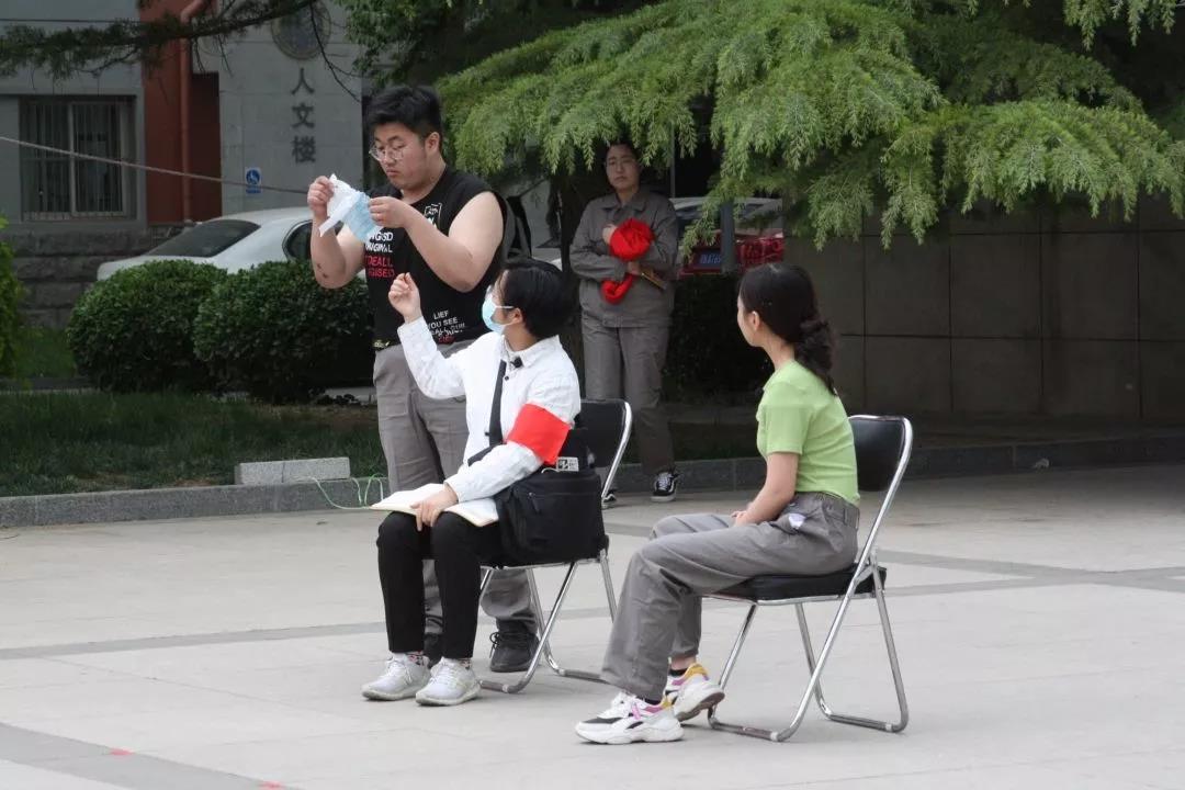 第四个节目同学们结合实际,以疫情故事背景,表演了新调任的老员工村官借助疫情引领滞留家乡无法外出打工的青年生产出售口罩,最终抗疫成功并实现全村脱贫的故事。