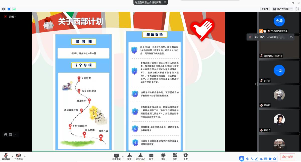 余有莉是“西部计划”的践行者,她曾获“2020-2021年度兵团老员工志愿服务西部计划优秀志愿者”称号,目前服务于新疆生产建设兵团第十师北屯市党委网信办。她对西部计划展开了详细介绍,服务期1至3年,服务协议一年一签,包括7个专项。她特别提到服务2年以上且考核合格的,服务期满后3年内报考硕士研究生,初试总分加10分,同等条件下优先录取。此外,她还介绍了该项目的政策保障、资金保障以及项目情况,帮助同学们更加深入了解“西部计划”。接着她向大家展示了新疆生产建设兵团的风采和生活,他们的奉献,他们给予百姓的温暖深深打动了每一位同学。最后,她分享了自己的工作日记,每一张照片背后蕴藏的充实和幸福感,都激发了同学们对西部计划的向往。