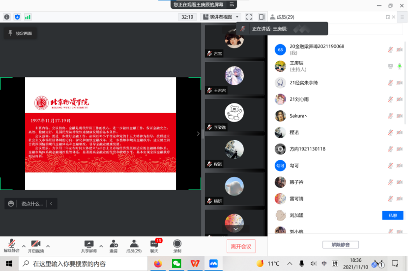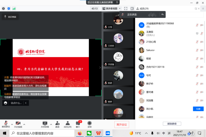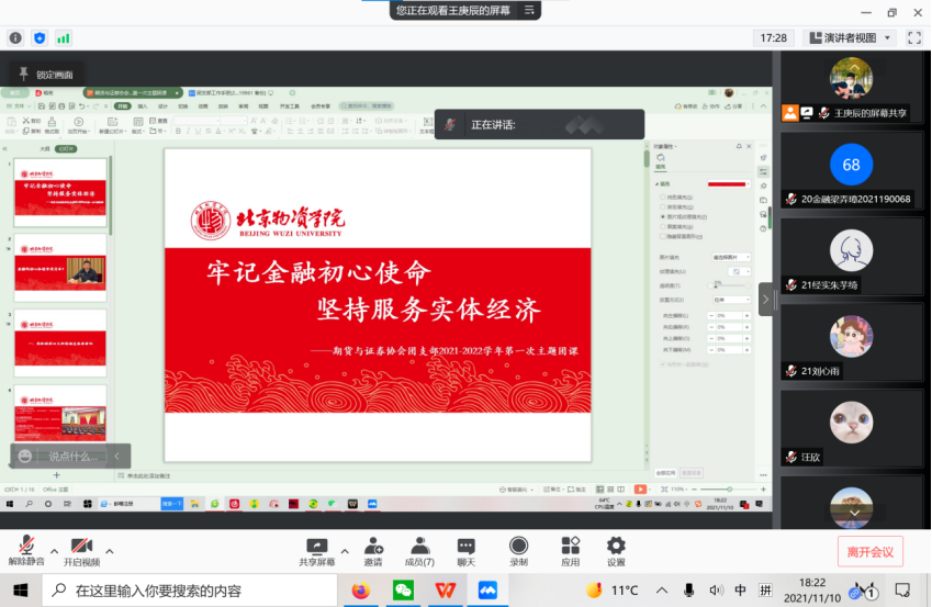 王庚辰同学首先提出问题“你学习金融的初心是什么”,引发各位团员的积极讨论。各部门团员表达了自己学习金融的初心,并将自己学习金融的初心使命与国家、社会发展相结合。
